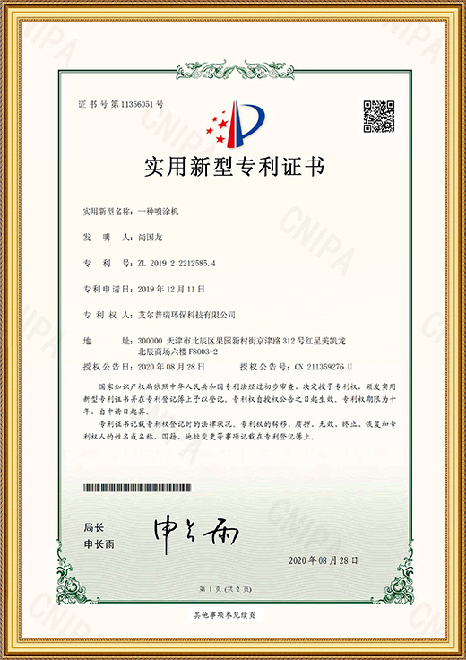 • 實(shí)用新型專利證書(一種噴涂機(jī))