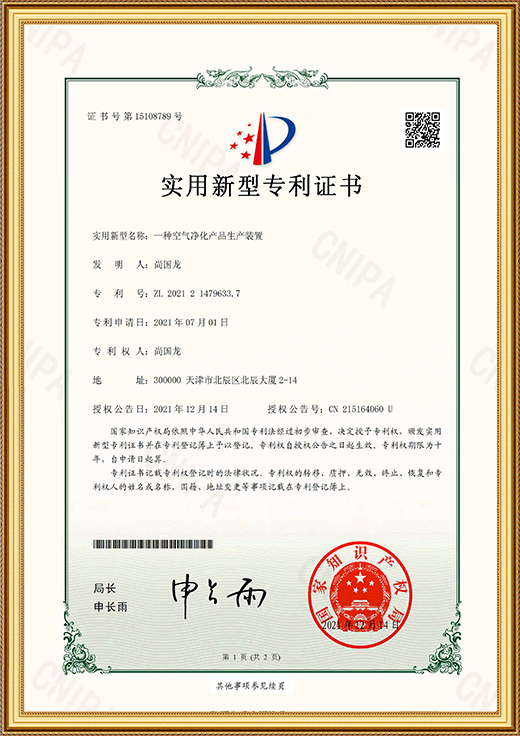 • 實(shí)用新型專利證書(一種空氣凈化產(chǎn)品生產(chǎn)裝置